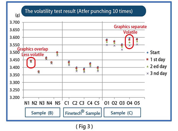 2. Mẫu Finetech® có thể giữ được độ bay hơi tốt hơn dung môi so với mẫu (C) như (Fig3).